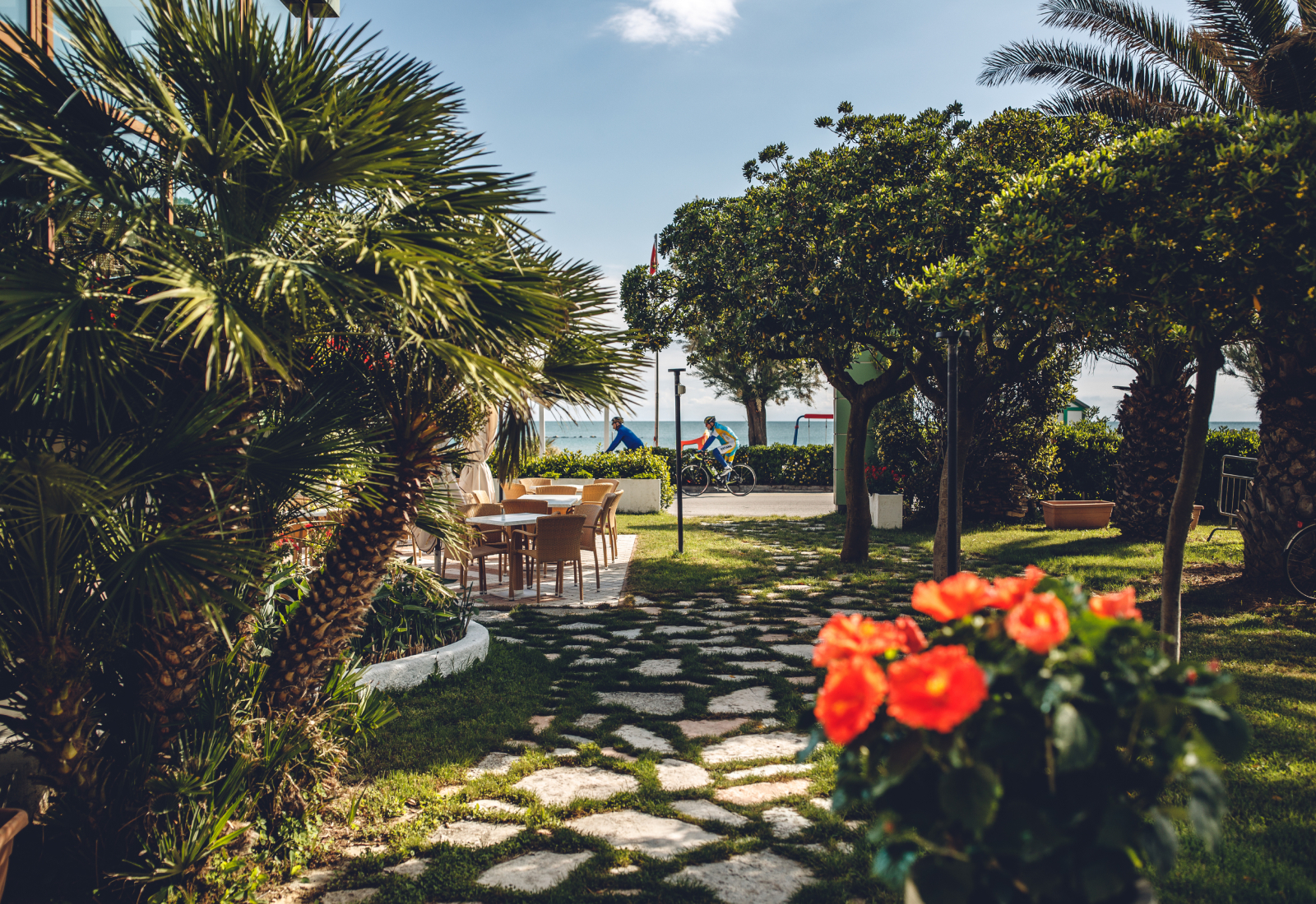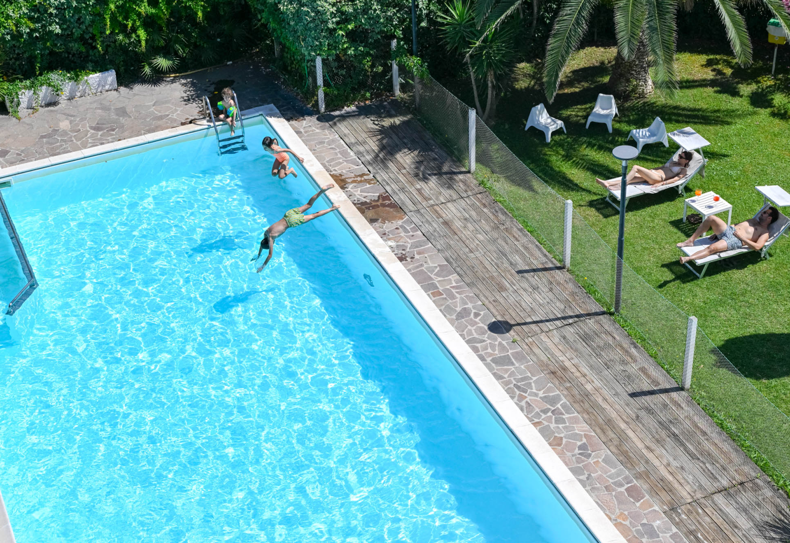 Il mare che ti fa compagnia in ogni momento della vacanza: dalle finestre della camera, mentre gusti la colazione in giardino, o ti fai trasportare dalle risate dei bambini e delle bambine che giocano con lo staff di animazione. Forse, solo forse, lasci il mare giusto per un tuffo in piscina… perché è circondata da un giardino di 4000 mq, che ti avvolge di verde e tranquillità.