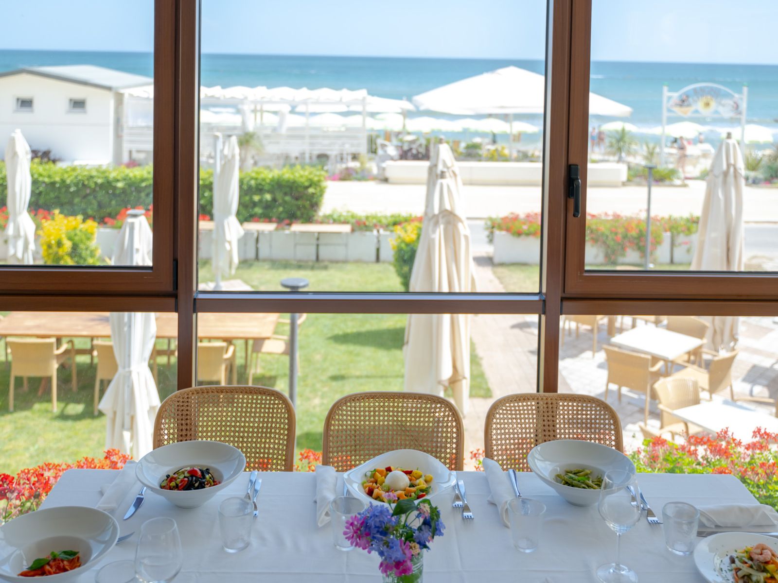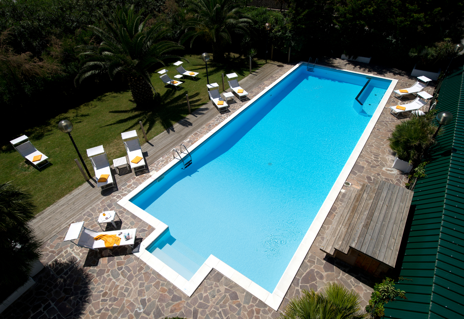 4000 mq di verde e una piscina che spicca come un cristallo, con solarium, aree relax, la zona riservata all’animazione per bambini e ragazzi. E il mare, proprio lì davanti.