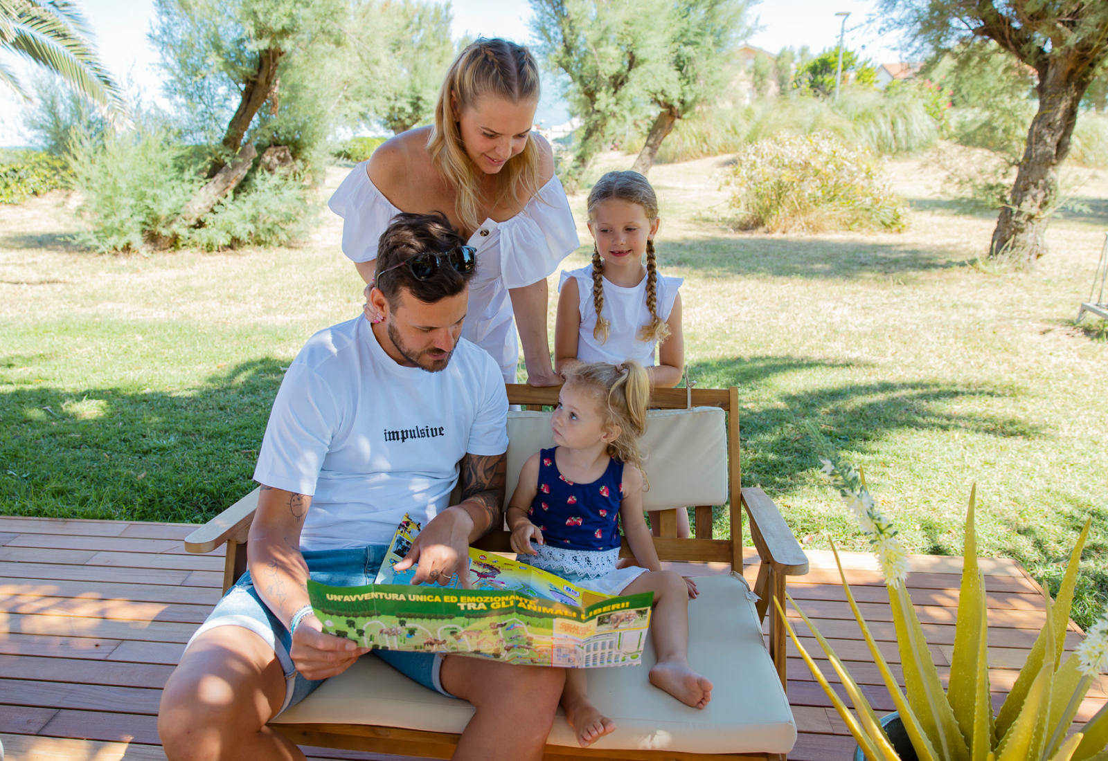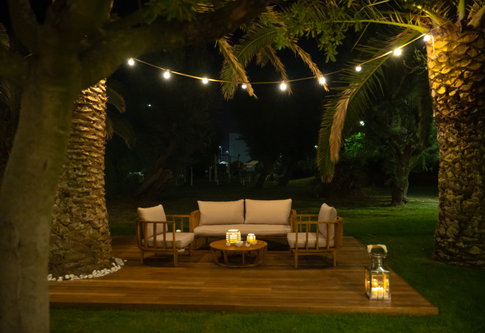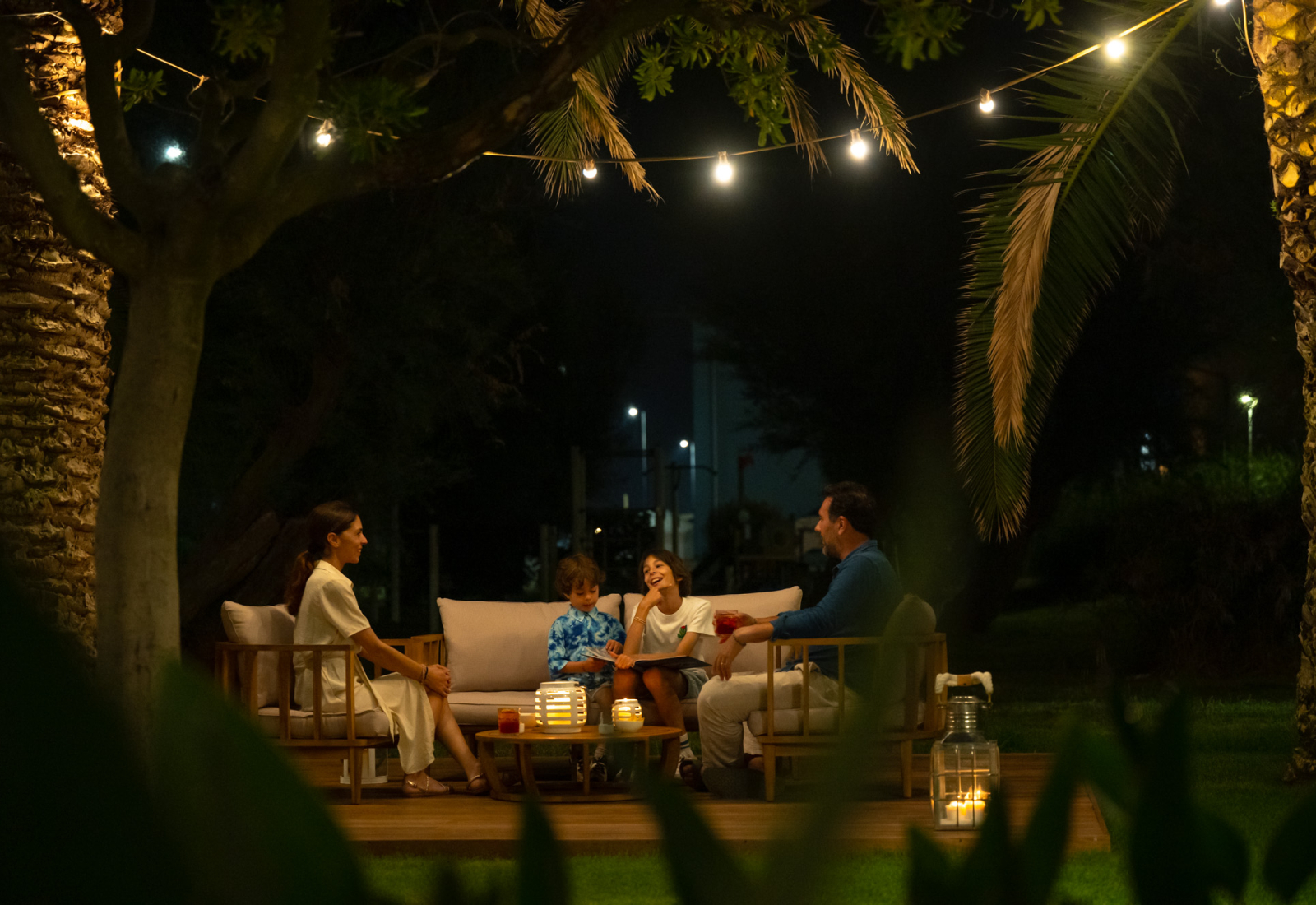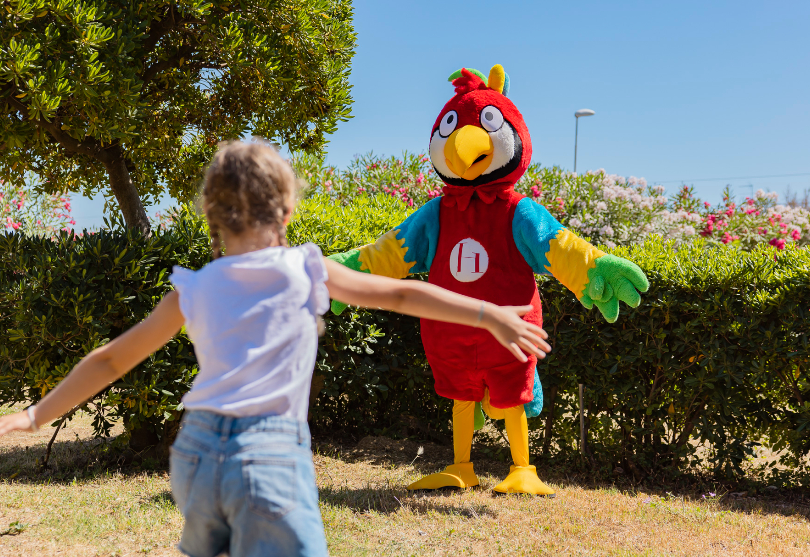 Neben den mit Tischen, Stühlen und Sofas ausgestatteten Bereichen gibt es im Garten einen Bereich, der für die von den Animateuren organisierten Aktivitäten reserviert ist, eine Rutsche und Schaukeln, eine Tischtennisplatte, einen Tischfußball und eine Bar, an der man nach dem Abendessen einen Cocktail oder ein Glas Wein unter dem Sternenhimmel genießen kann.