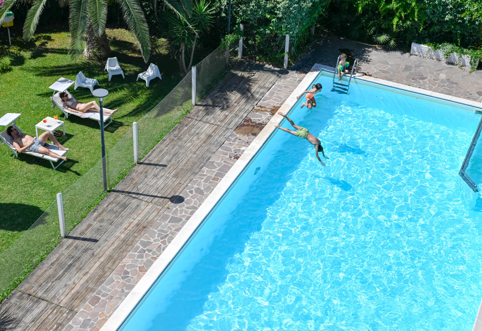 Manchmal wird das Salzwasser einem Schwimmbad vorgezogen, das mit einem Whirlpool ausgestattet ist und im Grünen eines geschützten Gartens liegt. In unserem Hotel mit Pool in Marotta di Fano ist es genau so: eine blaue Fläche, auf der man treiben kann, ohne an irgendetwas zu denken, oder die man mit den Augen streicheln kann, während man es sich auf den Liegen des Solariums gutgehen lässt – konzipiert als exklusiver Ruhebereich. Auch hier wollten wir im wahrsten Sinne des Wortes groß rauskommen, den Komfort in den Vordergrund stellen und jedem den Platz geben, den er braucht.