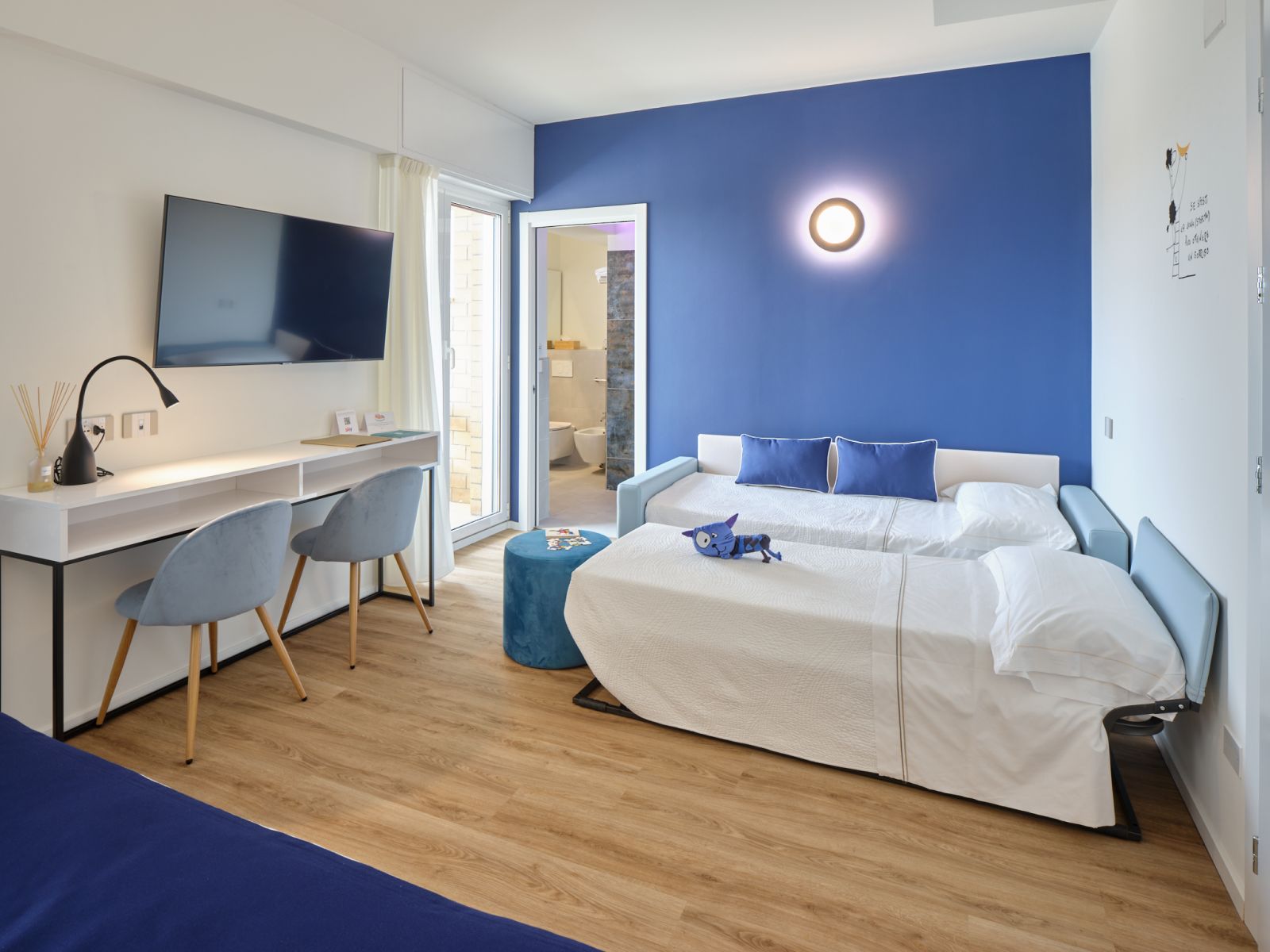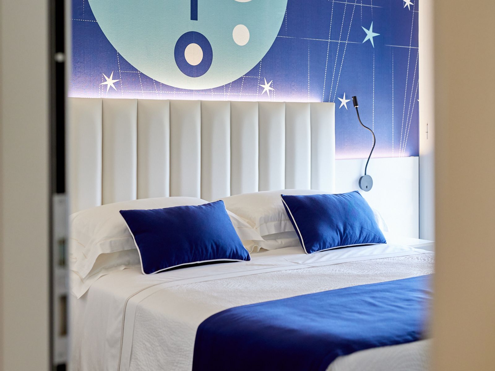 Everything is huuuuge in the Top Comfort Moon, a family room with a unique environment (very spacious!), with a super bathroom, a comfortable walk-in closet and 2 balconies. In this junior suite, inspired by the moon, you’ll find 2 double beds, or a double bed and a sitting area, or a double bed and 2 singles. Among the Top Comfort amenities, daily drinks from the minibar, a free beach bag and a front row beach umbrella and sunbeds are free