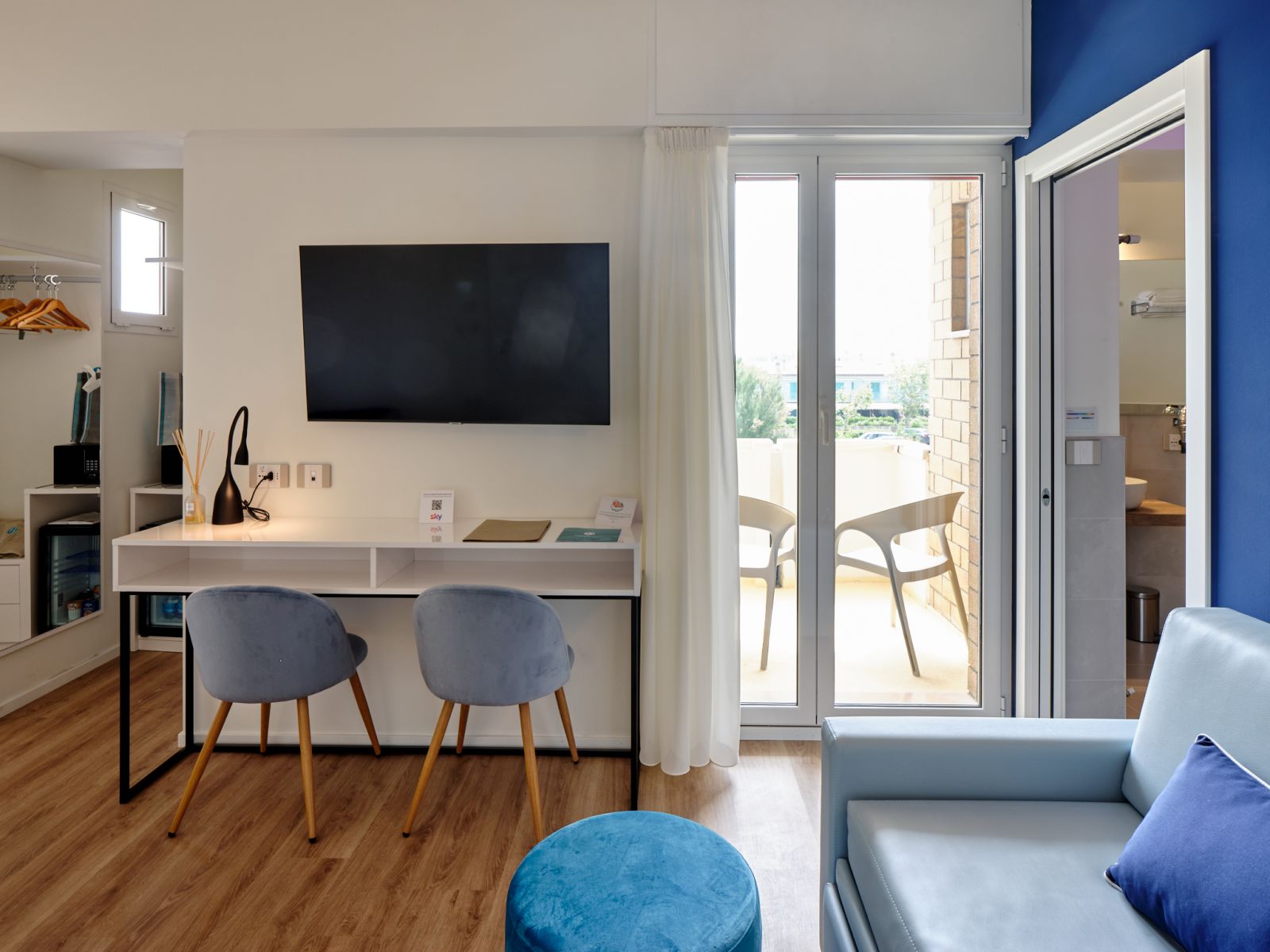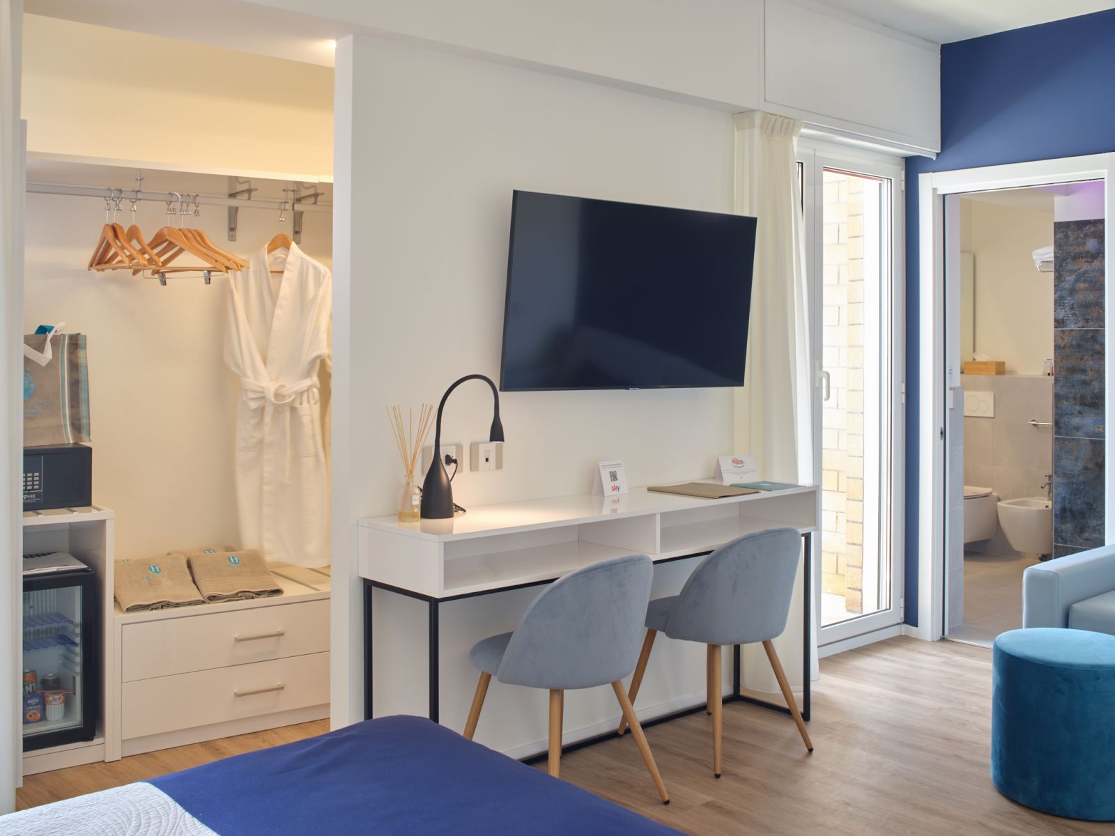 Nothing less than two balconies overlooking the sea are featured in a room that we restructured to offer you an unforgettable holiday